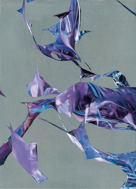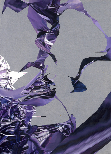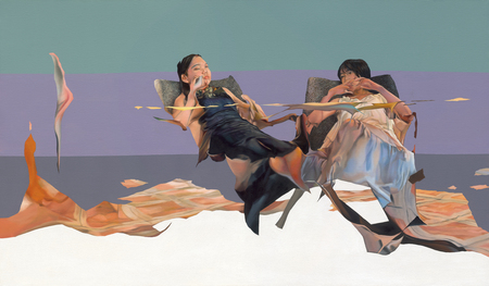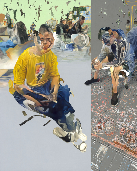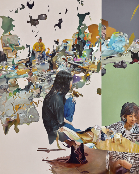 在此次發表的作品中,所描寫的那一群身處這個虛實交替的時代的年輕人,各異的情緒表情,難以對焦的眼神,相互沒有交集卻又「被」聚集在同一「空間」;生活對他們這個世代而言並沒有太多的追求,面對城市顯得無能為力,網路也許是他們僅存的避世路徑,苦苦掙扎的似乎也難逃躺平的結局。這樣的世代情節、這樣的處境其實在人類歷史中總是反覆上演,並不是特指某一個世代的專利,但身處其中卻難自禁!尤其在當代資本主義當道,網路資訊發達的社會,其複雜程度更甚以往,而他們所面對的更為深沉。我思考藉由片面的觀察書寫關於這個時代的現象,僅能以片段的線索在繪畫裡推敲;我無從得知千百年來文人雅士競相追逐的桃花源在何方?只能藉此探問「桃花源」該是什麼樣的?存在現實裡?抑或只能在虛無飄渺的網路世界遍尋其蹤?