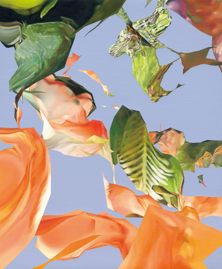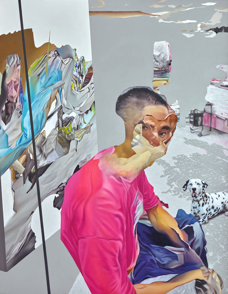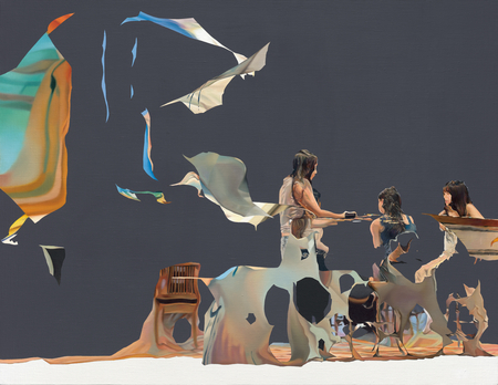 哲人日已遠,我不打算追尋五柳先生 1 的桃花源,也沒有能力描繪湯瑪斯・摩爾(Thomas More,1478−1535)的烏托邦,只能將其視為一個念想,一個既抽象又模糊的概念。反之,在畫布上我試圖重構那些散落的記憶片段與妄想,混置著日常現象、生活點滴、輿論見聞與主觀意識。虛擬的空間穿插著被攝影元件扭曲模糊的莫名色面,毫無規則的透視反而增幅了場域的開放性與可塑性,使其成為展開的、多向度的舞台。此一「人為再造」的世界,讓非線性的敘事邏輯得以開展,從而探問何謂「桃花源」。居伊·恩斯特·德波(Guy Ernest Dobord, 1931-1994)在《奇觀社會》(The Society of the Spectacle)一書,宣吿了世界已然成為奇觀的社會2。現今資本主義時代,網絡、數位科技與我們日常生活存在密切相關的現象,一如德波所言,社會已經到達了「綜合景觀」( integrated spectacle ) 的階段,我們清楚意識到景觀的被製造性,可卻沈迷其中而無法自拔,甚或忘卻了本真社會,墜入一種錯綜複雜的交互作用閉環。數位科技帶來了便利,但也使得機械虛構與現實生活的界限逐漸裂解,人類對於數位科技與網路的依賴,模糊了我們對現實的察覺,與對真相的判准,導致於虛擬轉移至現實社會的幻覺持續擴延。